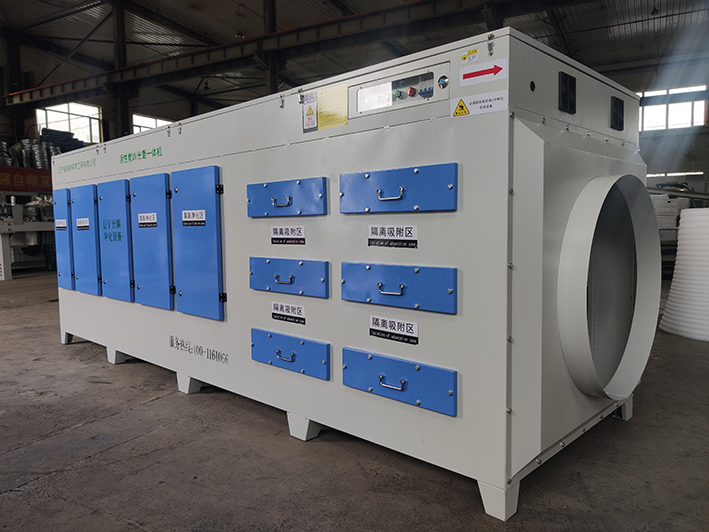 當惡臭氣體利用排風設(shè)備輸入到本凈化設(shè)備后,凈化設(shè)備運用高能C波光束及臭氧對惡臭氣體進行協(xié)同分解氧化反應(yīng),使惡臭氣體物質(zhì)其降解轉(zhuǎn)化成低分子化合物、水和二氧化碳,再通過排風管道排出室外。